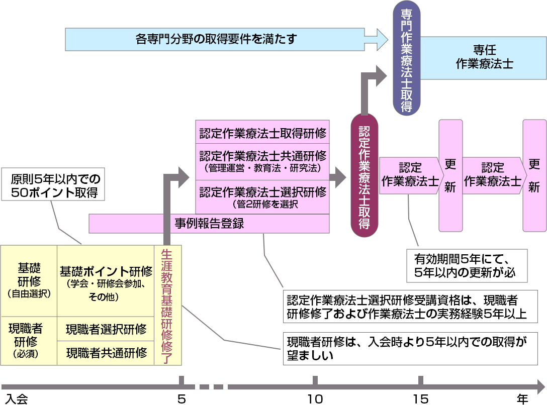 本制度は「生涯教育基礎研修」「生涯教育認定作業療法士取得研修」「生涯教育専門作業療法士取得研修」の3つから成ります。